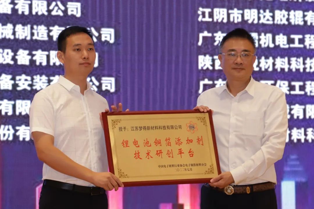 △中國電子材料行業(yè)協(xié)會電子銅箔材料分會授予江蘇夢得新材料科技有限公司“鋰電池銅箔添加劑技術(shù)研創(chuàng)平臺”授牌儀式